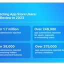 No que toca às aplicações na loja, e como já tinha revelado, a empresa refere que em 2023 rejeitou mais de 1,7 milhões pedidos de submissão de aplicações, por não cumprirem os requisitos da loja em matéria de privacidade, segurança ou conteúdos. No âmbito dos mesmos esforços de combate à fraude a empresa indica que encerrou as contas de 374 milhões de programadores e utilizadores e que eliminou 152 milhões de reviews e classificações.